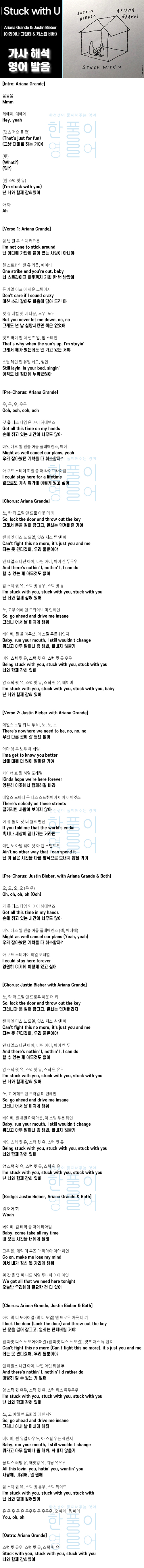 Stuck with U - Ariana Grande & Justin Bieber (아리아나 그란데 & 저스틴 비버) [가사 해석, 번역 / 영어 한글 발음]