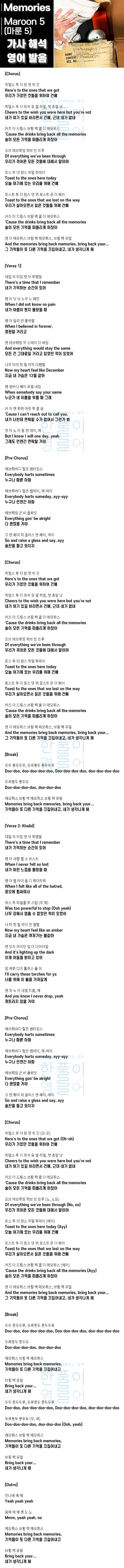 Memories - 마룬5(마룬파이브) (Maroon 5) [가사 해석 / 번역 / 영어 한글 발음]