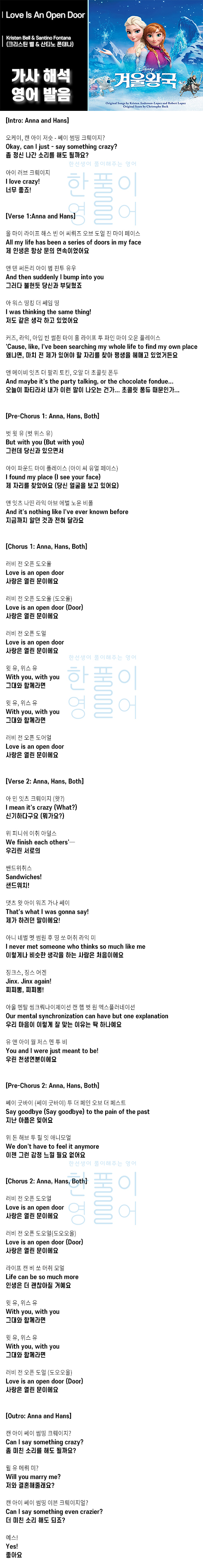 Love Is An Open Door - 겨울 왕국1 OST [가사 해석 / 번역 / 영어 한글 발음]