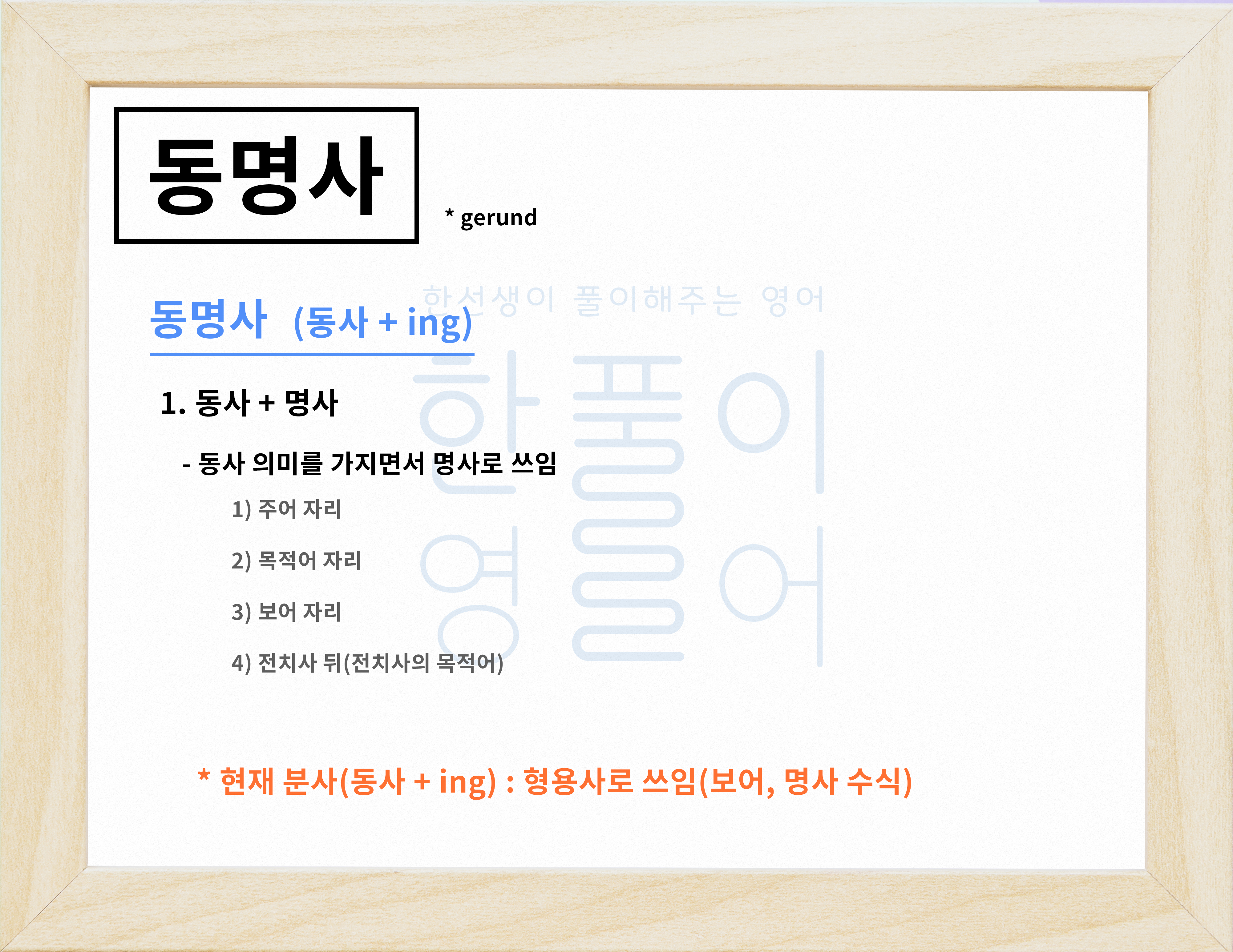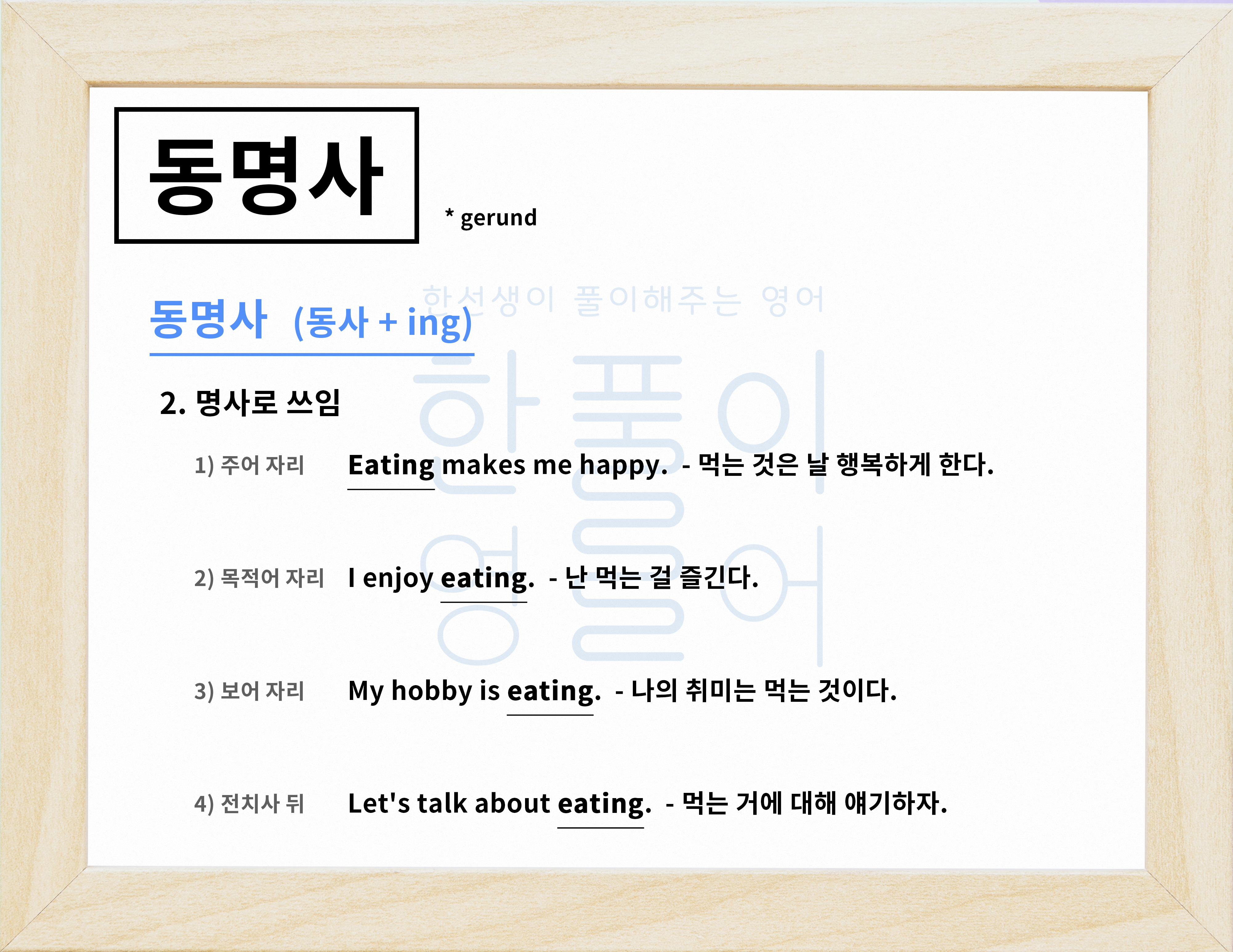 동명사 개념(동사+ing), 주어/목적어/보어 자리/전치사 뒤에 쓰임 현재 분사와 다른 점 [영어 문법 풀이 #45]
