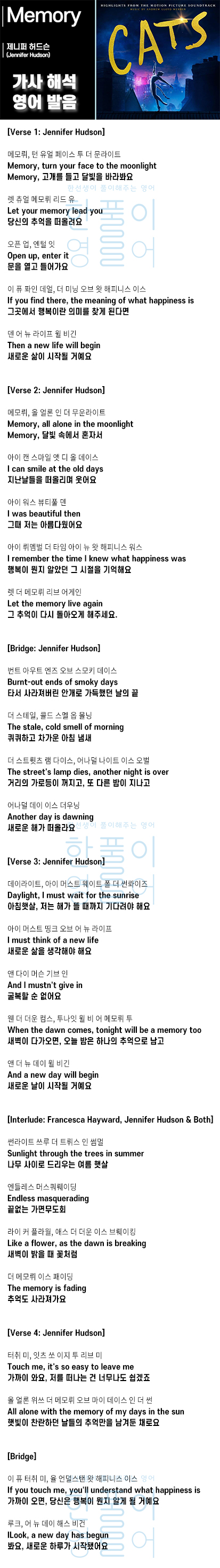 Memory - 영화 캣츠 OST 제니퍼 허드슨 (Jennifer Hudson) [가사 해석, 번역 / 영어 한글 발음]