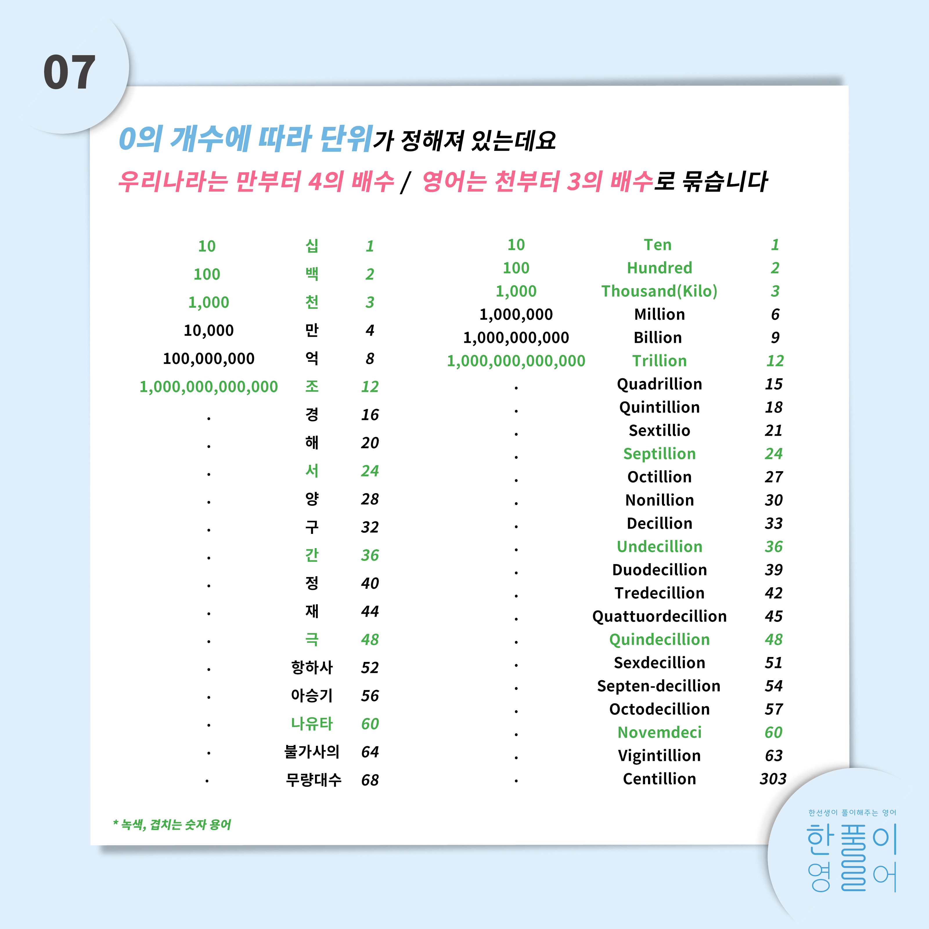 영어 숫자와 우리 숫자를 비교해봤습니다.