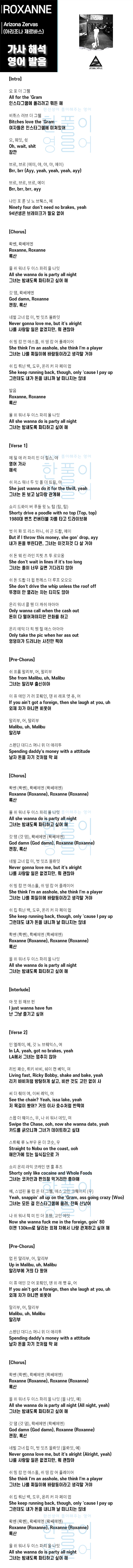 ROXANNE - 아리조나 제르바스 (Arizona Zervas) [가사 해석, 번역 / 영어 한글 발음]