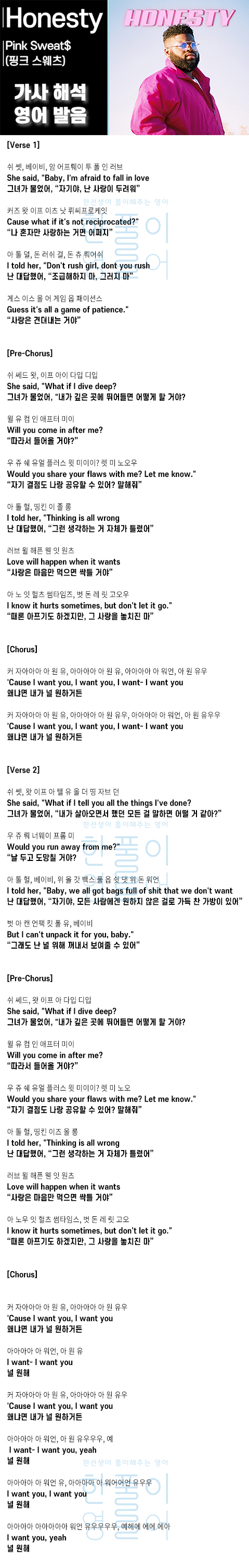 Honesty - Pink Sweat$ ( 핑크 스웨츠) [가사 해석, 번역 / 영어 한글 발음]