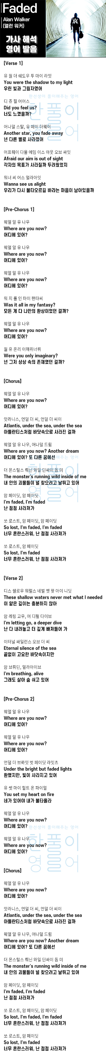 Faded - 앨런 워커(Alan Walker) [가사 해석, 번역 / 영어 한글 발음]