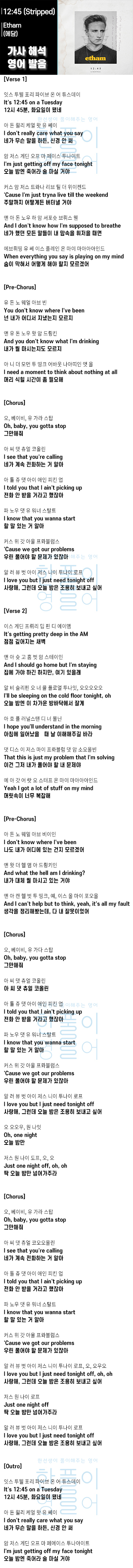 12:45 (Stripped) - Etham (에담) [가사 해석, 번역 / 영어 한글 발음]