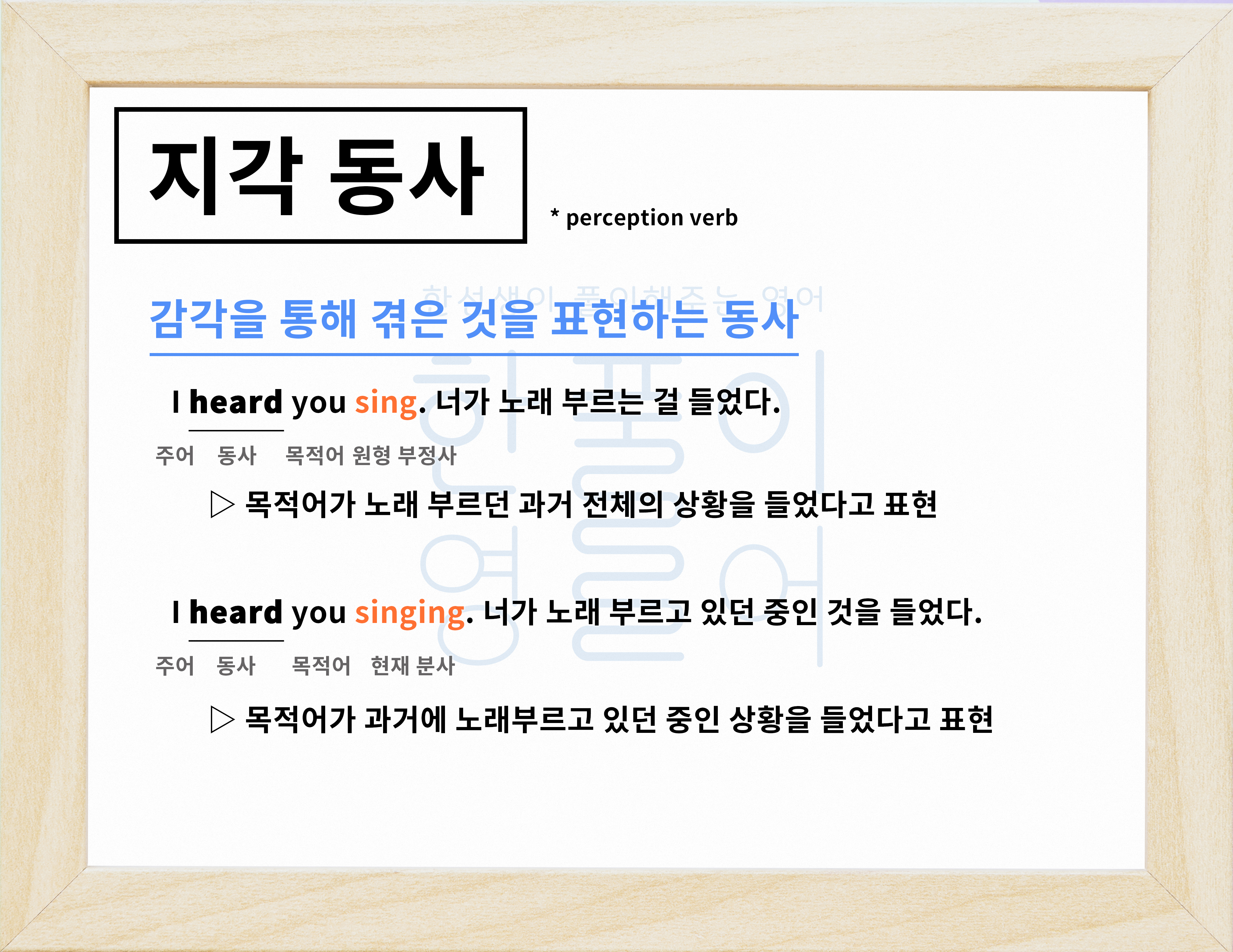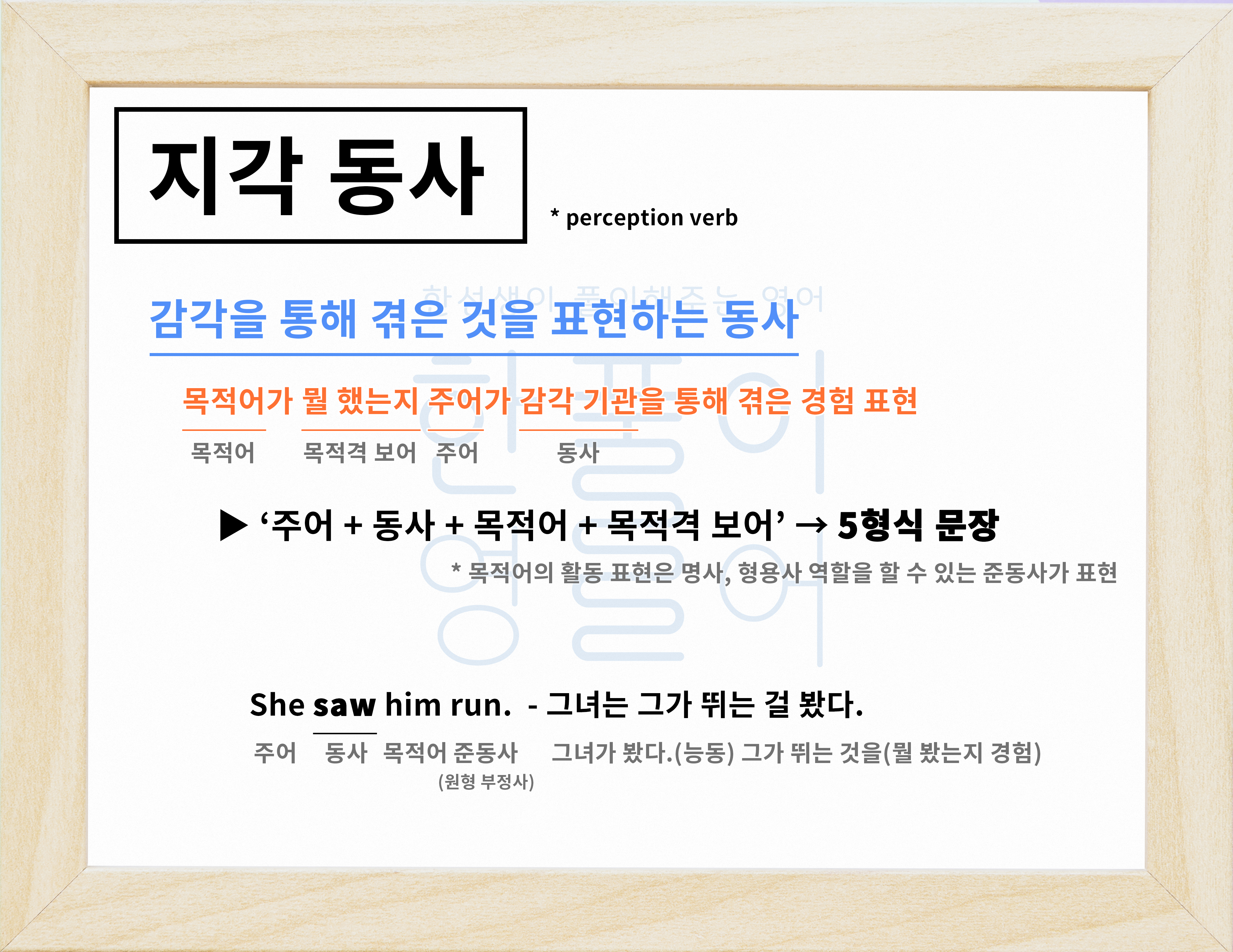 5형식 문장에서 지각 의미 동사가 사용돼요.