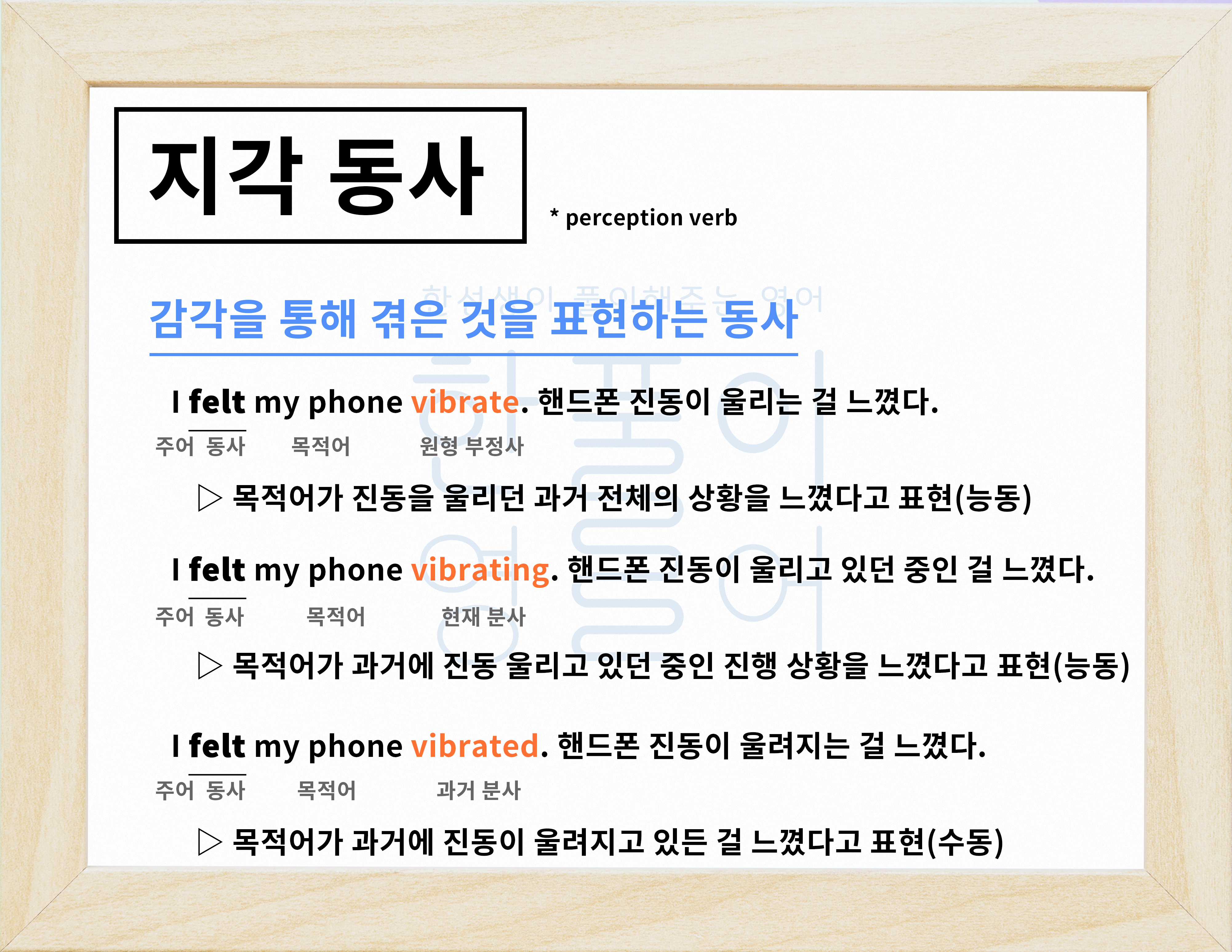 지각 의미 동사가 그걸 표현해줘야 하구요.