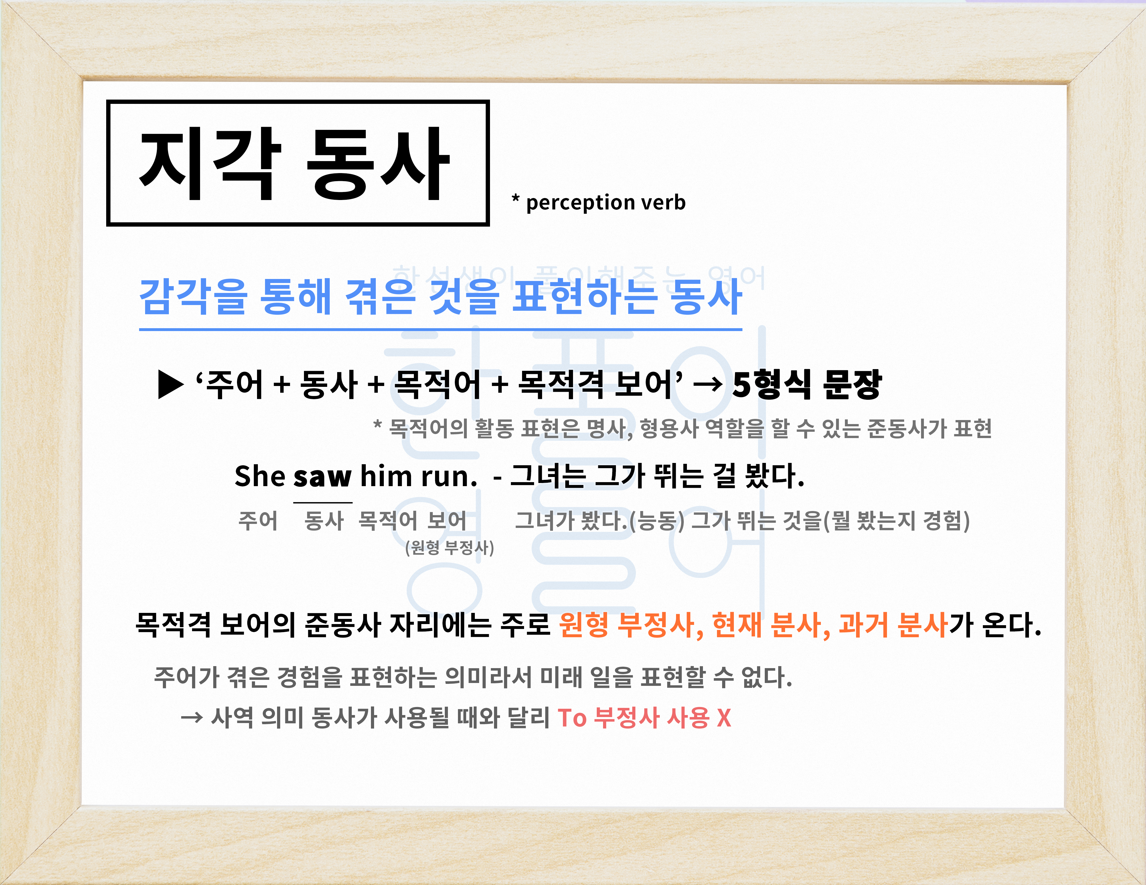 5형식 문장에서 지각 의미 동사가 사용돼요.