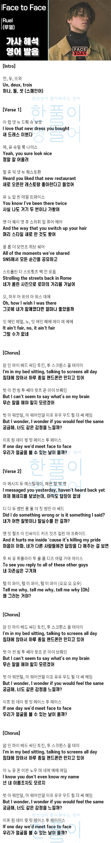 Face to Face - Ruel (루엘) [가사 해석, 번역 / 영어 한글 발음]