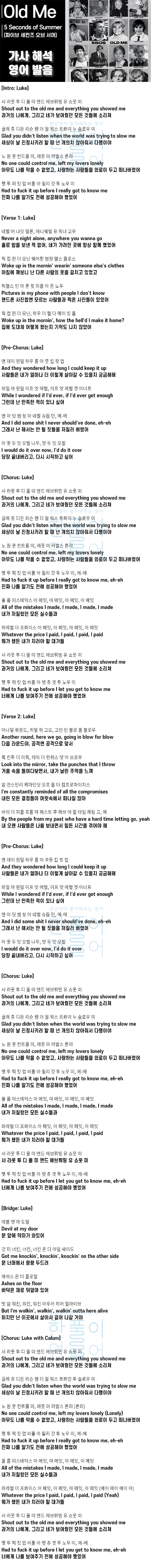 Old me - 5 Seconds of Summer(5 SOS, 파이브 세컨즈 오브 서머) [가사 해석, 번역 / 영어 한글 발음]