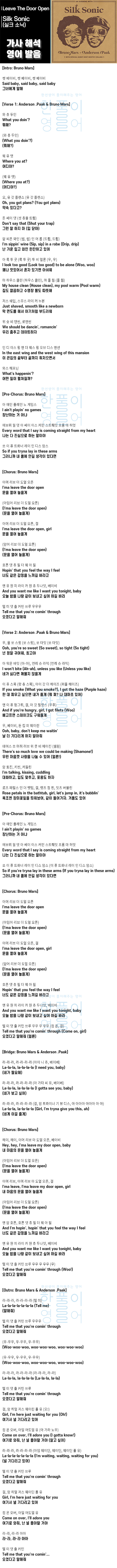 Leave The Door Open - Silk Sonic (실크 소닉) [가사 해석, 번역 / 영어 한글 발음]