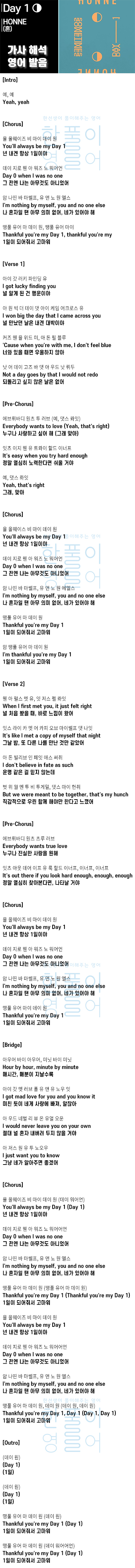 Day 1 ◑ - HONNE (혼) [가사 해석, 번역 / 영어 한글 발음]