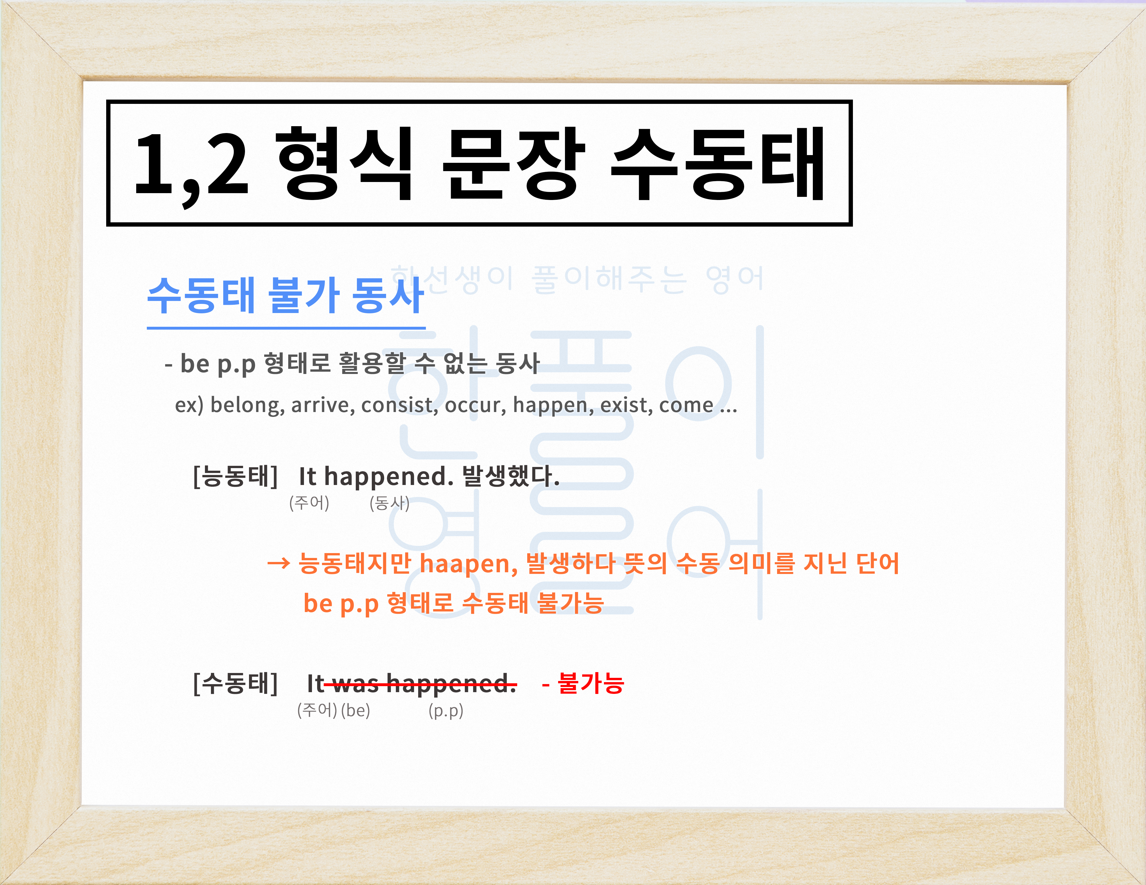 아까 happen 단어처럼 수동태가 불가능한 단어도 있고