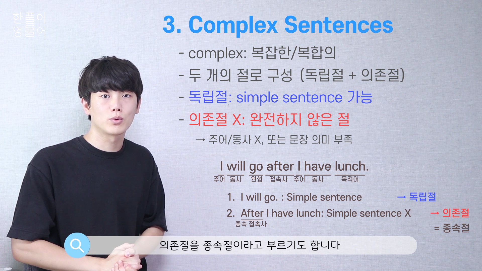 의존절은 독립할 수 없어요, 주어나 동사가 없거나, 문장 구성 요소를 다 갖췄더라도 의미적으로 완성이 되지 않은 거예요.