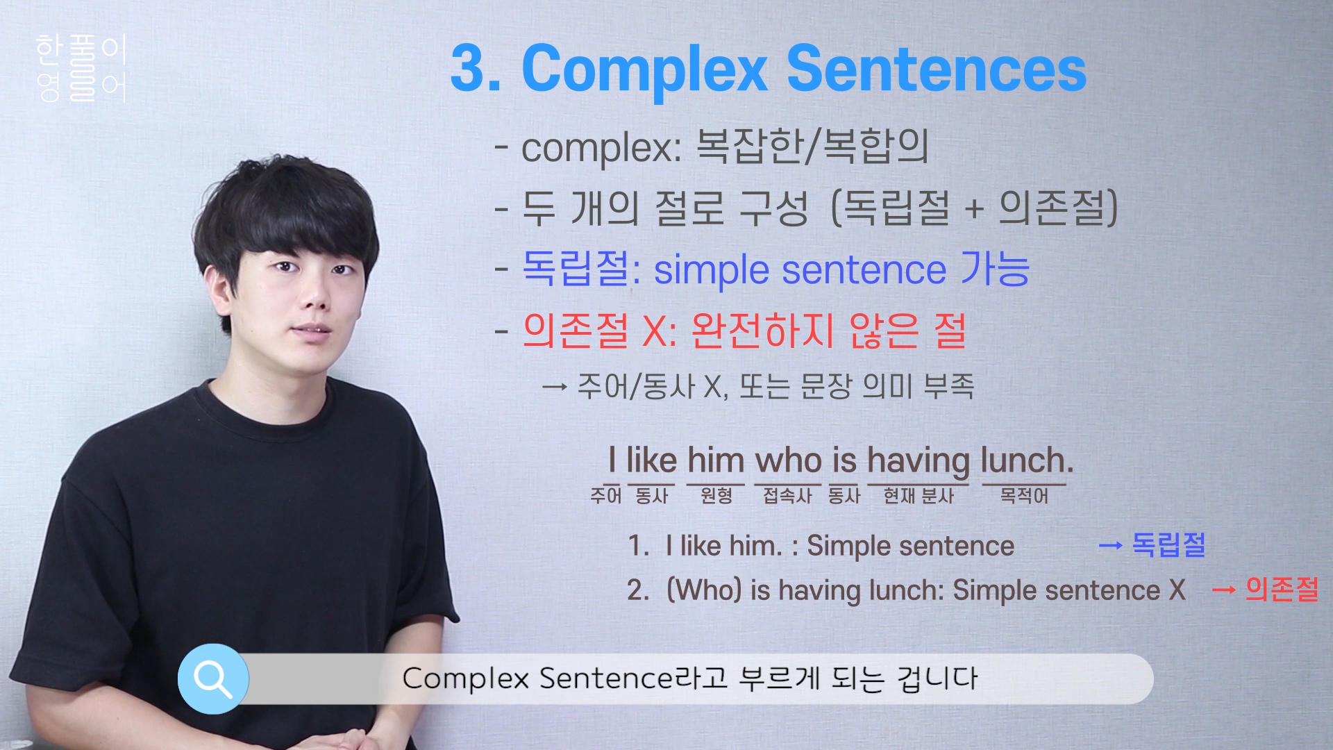 I like him who is eating lunch. 나는 점심 먹고 있는 저 남자를 좋아해.
