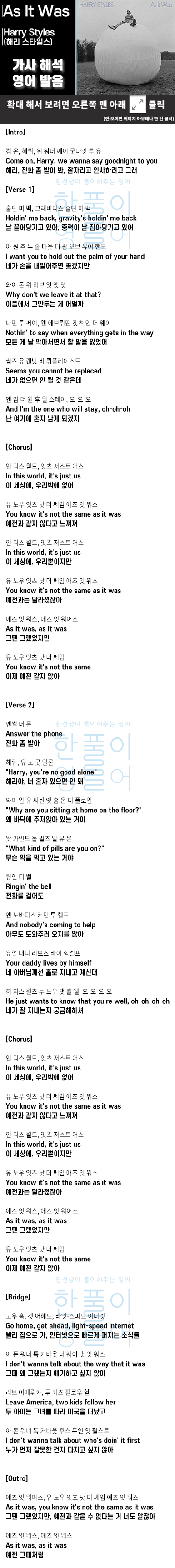 As It Was - Harry Styles(해리 스타일스) [가사 해석, 번역 / 영어 한글 발음]