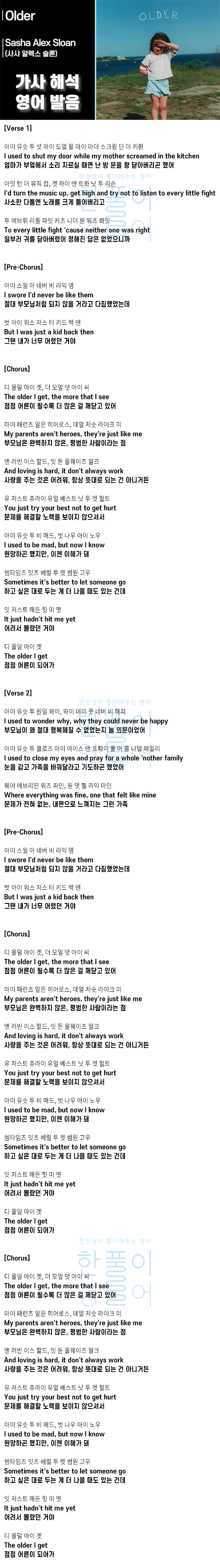 Older - 사샤 알렉스 슬론(Sasha Alex Sloan) [가사 해석, 번역 / 영어 한글 발음]